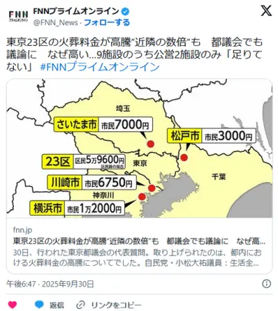 【東京】23区の火葬料金が高騰“近隣の数倍”も 都議会でも議論に なぜ高い…9施設のうち公営2施設のみ「足りてない」