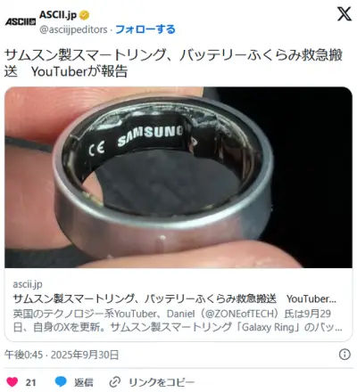 サムスン製スマートリングバッテリー膨張し指から外せない→病院搬送→飛行機搭乗拒否、呪いの指輪