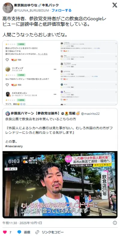 奈良公園で25年やってる飲食店「外人のシカ虐待見たことない」→高市支持者、GoogleMap低評価攻撃