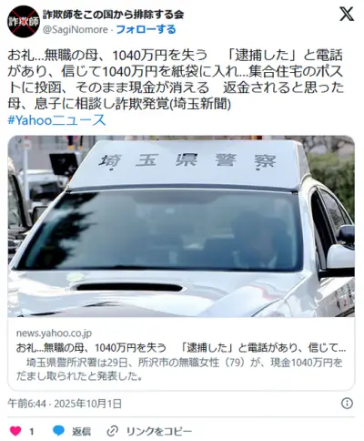 【埼玉】お礼…無職の母、1040万円を失う 「逮捕した」と電話があり、信じて1040万円を紙袋に入れ…ポストに投函 息子に相談し詐欺発覚