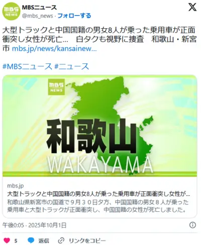 大型トラックと中国国籍の男女8人が乗った乗用車が正面衝突し女性が死亡…白タクも視野に捜査