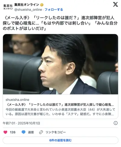 【文春】「リークしたのは誰だ?」進次郎陣営が犯人探しで疑心暗鬼に…「もはや内部では刺し合い」
