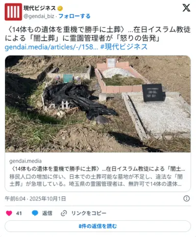 【悲報】イスラム教徒さん、重機を使って霊園に許可なく14体の遺体を勝手に土葬してしまう