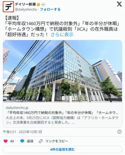 【悲報】JICA職員さん、平均年収1460万円で納税の対象外だったwww