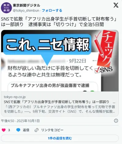 東京新聞「アフリカ人が手首を切断し財布強奪はデマ!本当は盗んでから切りつけ!」結局の所強盗では?