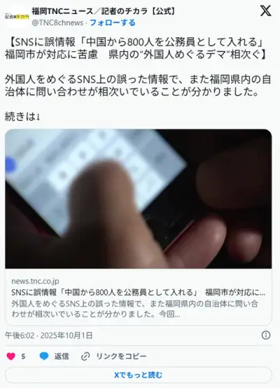 「中国から800人を公務員として入れる」という最低最悪なデマが拡散され福岡市大混乱