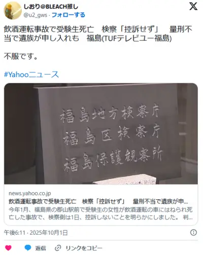 【福島】飲酒運転事故で受験生死亡 検察「控訴せず」 量刑不当で遺族が申し入れも