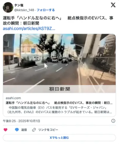 中国製EVバスの運転手「ハンドルを左に切ったら右に流れた」