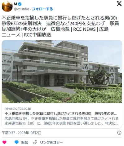 【広島】不正乗車を指摘した駅員を暴行し骨折させ追徴金240円を支払わず…男に懲役6年の実刑判決