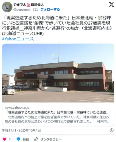神奈川・27歳会社員「はあ…現実逃避したいな…」 →北海道の国道を全裸で歩いて逮捕