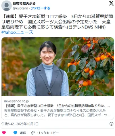 愛子さま新型コロナ感染 5日からの滋賀県訪問は取りやめ、国民スポーツ大会出席の予定だった 天皇皇后両陛下も検査へ