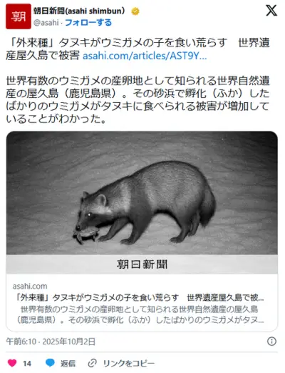 【鹿児島】「国内外来種」タヌキがウミガメの子を食い荒らす 世界遺産屋久島で被害