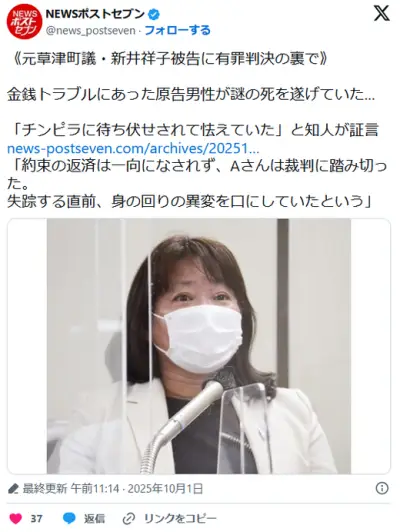 【元草津町議・新井祥子被告に有罪判決】金銭トラブルにあった原告男性が謎の死を遂げていた…「チンピラに待ち伏せされて怯えていた」