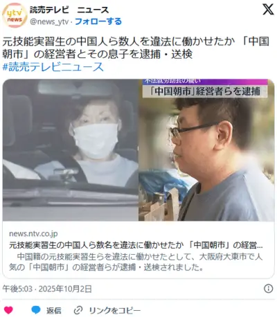 【大阪】元技能実習生の中国人ら数名を違法に働かせたか 「中国朝市」の経営者とその息子を逮捕・送検 大東市