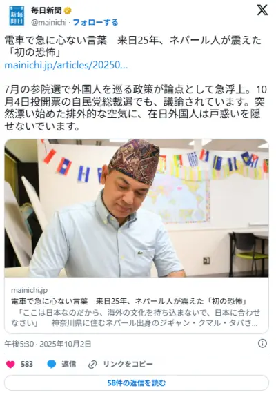 日本在住のネパール人、帽子を被っていた所日本人に「日本だから日本に合わせなさいよ」と言われ恐怖