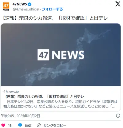 【速報】奈良のシカ報道、「取材で確認」と日テレ