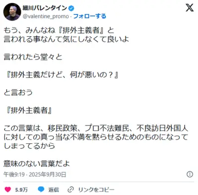 細川バレンタイン「もう、みんなね『排外主義者』と言われる事なんて気にしなくて良いよ」
