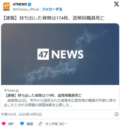 【闇】造幣局から貨幣を持ち出した職員が死亡