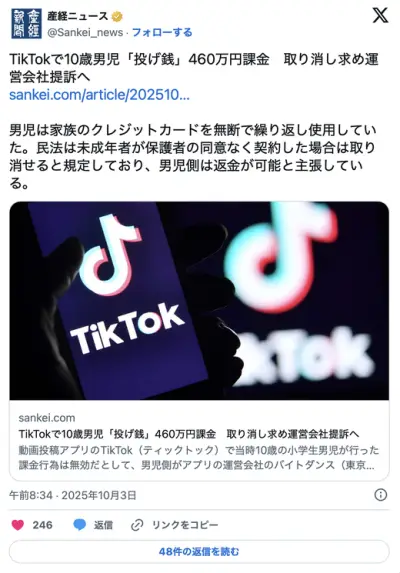 【京都】TikTokで10歳男児「投げ銭」460万円課金 取り消し求め運営会社提訴へ -京都地裁