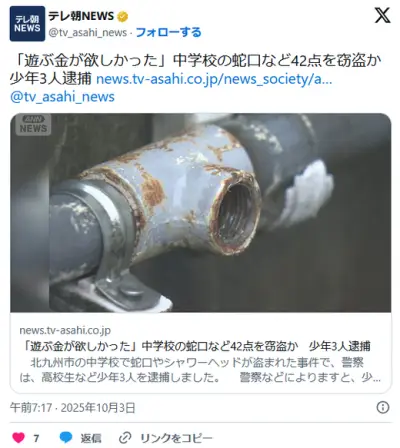 【北九州】「遊ぶ金が欲しかった。面白半分でやった」中学校の蛇口など42点を窃盗か 高校生など少年3人逮捕