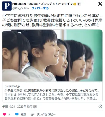 【北海道】小学生に蹴られた男性教員が反射的に蹴り返したら減給…子どもは何でも許され「教員は我慢しろ」でいいのか (公立小教員)