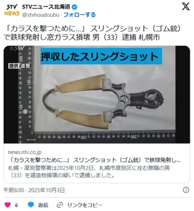 【北海道札幌】「カラスを撃つために」スリングショット(パチンコ)で鉄球発射し窓ガラス壊した無職男(33)逮捕