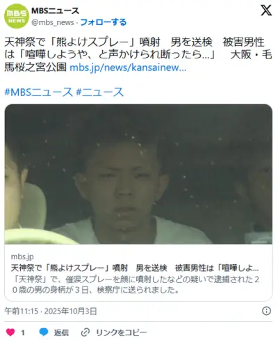 【博多】「喧嘩しようや」と声かけられ断ると熊よけスプレー噴射され…天神祭で無職男(20)逮捕