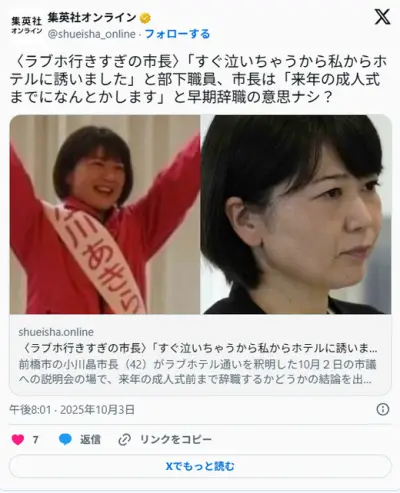 【ラブホ行きすぎ市長】部下職員「すぐ泣いちゃうから私からホテルに誘いました」 市長「来年の成人式までに…」早期辞職の意思ナシ?