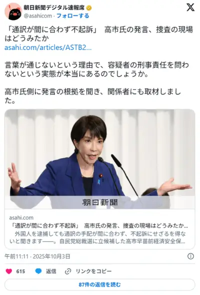 高市早苗氏「外国人を逮捕しても通訳の手配が間に合わず、不起訴にせざるを得ない」 警察幹部、検察幹部ともに「聞いたことがない」