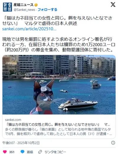 マルタ島で猫を虐殺した日本人「猫はカネ目当ての女と同じ。餌を与えないと撫でさせない」