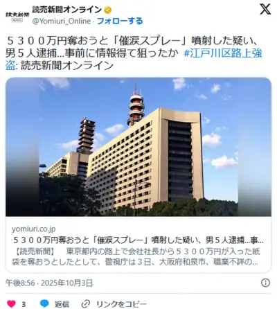 【東京・江戸川】会社社長から5300万円奪おうと「催涙スプレー」噴射した疑い、大阪府の男ら5人逮捕…事前に情報得て狙ったか
