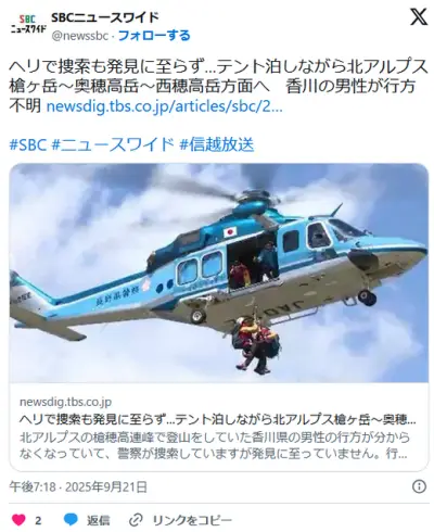 ヘリで捜索も発見に至らず…テント泊しながら北アルプス槍ヶ岳~奥穂高岳~西穂高岳方面へ 香川の33歳公務員男性が行方不明