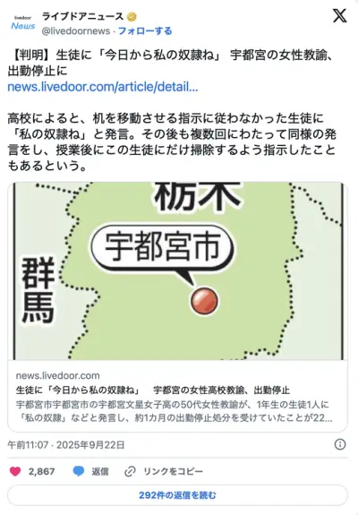 【栃木】生徒に「今日から私の奴隷ね」 宇都宮の50代女性高校教諭、出勤停止
