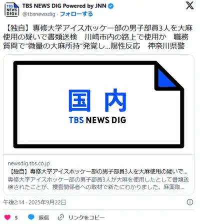 専修大学アイスホッケー部の男子部員3人を大麻使用の疑いで書類送検