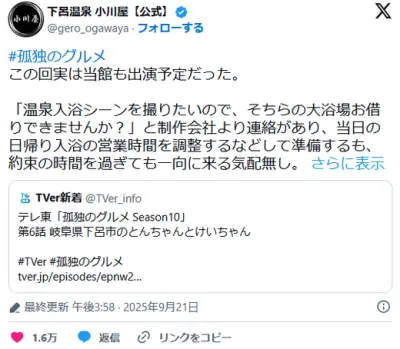 【画像】テレ東「孤独のグルメ」温泉旅館の貸切予約を無連絡キャンセルして大炎上WWWWWWWWW