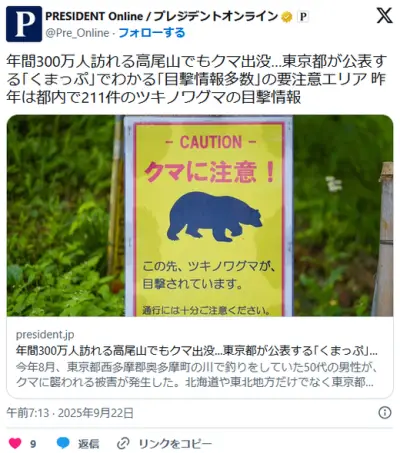 年間300万人訪れる高尾山でも出没…東京都が公表する「くまっぷ」でわかる目撃情報多数の要注意エリア 世界的にも珍しいクマ生息の首都