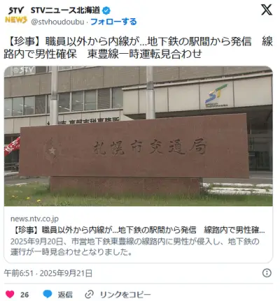 【珍事】職員以外から内線が…市営地下鉄の駅間から発信 線路内で男性確保 東豊線一時運転見合わせ 北海道札幌市