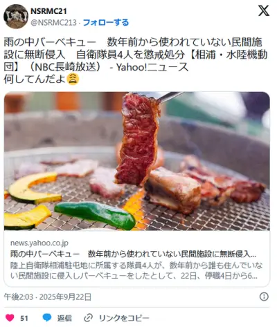 【長崎】雨の中バーベキュー 数年前から使われていない民間施設に無断侵入 自衛隊員4人を懲戒処分 相浦・水陸機動団