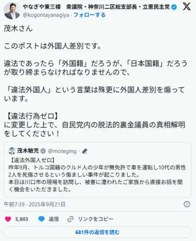 【炎上】 立憲民主党 「『違法外国人ゼロ』は差別」 →