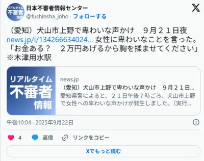 【犬山】長身の好青年が女性に「2万円でおっぱい揉ませて」と相場無視の高値を提示するも通報される