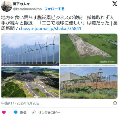 【エネルギー】地方を食い荒らす脱炭素ビジネスの破綻 採算取れず大手が続々と撤退 「エコで地球に優しい」は嘘だった