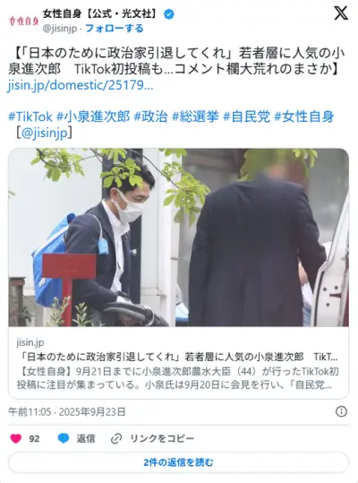 小泉進次郎氏 TikTok初投稿も…コメント欄大荒れ