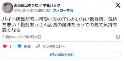 【悲報】女性「店員が若い可愛い女の子ばかりの店気持ち悪い。絶対おっさん店長の趣味だろ」