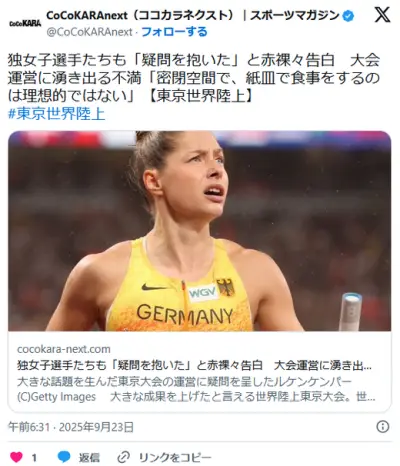 【世界陸上】ドイツ選手たちが大会運営に不満「密閉空間で、紙皿で食事をするのは理想的ではない」 独誌「世界レベルとは程遠い」
