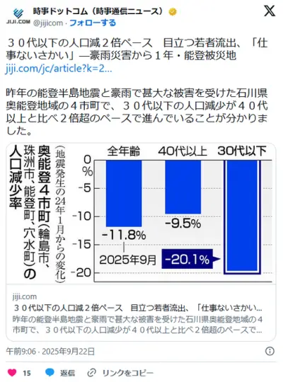 【能登被災地】30代以下の人口減2倍ペース 目立つ若者流出、「仕事ないさかい」―豪雨災害から1年