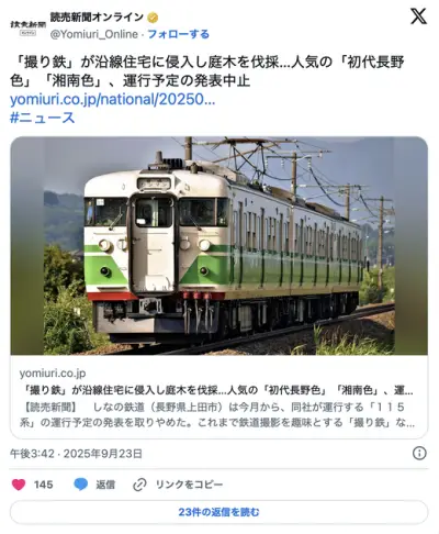 【しなの鉄道】「撮り鉄」が沿線住宅に侵入し庭木を伐採…人気の「初代長野色」「湘南色」、運行予定の発表中止
