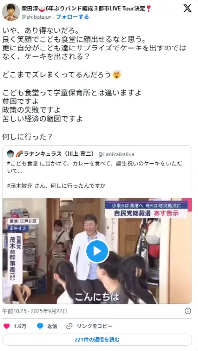【柴田淳】女性歌手が疑問「あり得ないだろ」自民総裁候補が子ども食堂で誕生日ケーキを出される姿に (茂木氏)