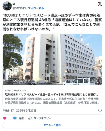 会社役員(48)「なんでこんな事で逮捕されるのか!」速度超過を認めず青切符から現行犯逮捕に昇格