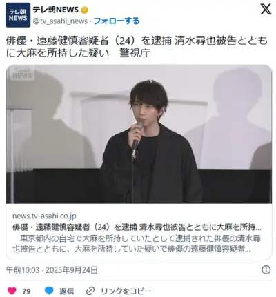 【芸能】俳優・遠藤健慎容疑者(24)を逮捕 清水尋也被告とともに大麻を所持した疑い 警視庁