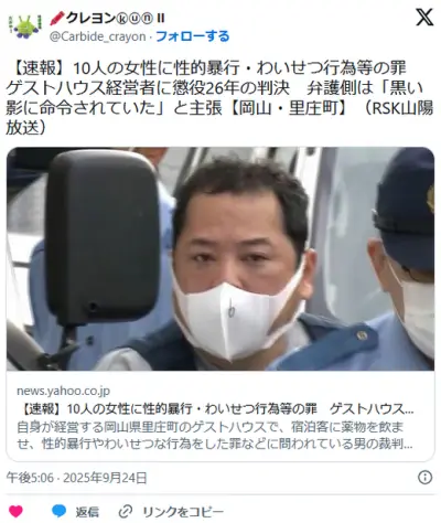 10人の女性に性的暴行・わいせつ行為等の罪 ゲストハウス経営者に懲役26年の判決 弁護側「黒い影に命令されていた」 岡山地裁